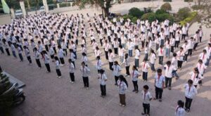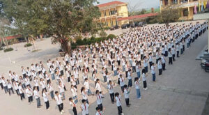 Khi tiếng trống báo hiệu kết thúc 2 tiết học buổi sáng, tất cả học sinh nô nức ùa xuống sân trường, xếp hàng ngăn nắp để cùng nhau hòa vào những điệu múa hát sân trường vui tươi, sôi động. Đây là lúc các em được vận động, nhảy múa, giải tỏa mọi mệt mỏi, căng thẳng sau những giờ học trên lớp và cũng là dịp để các em trở nên gần gũi, thân thiết với nhau hơn.